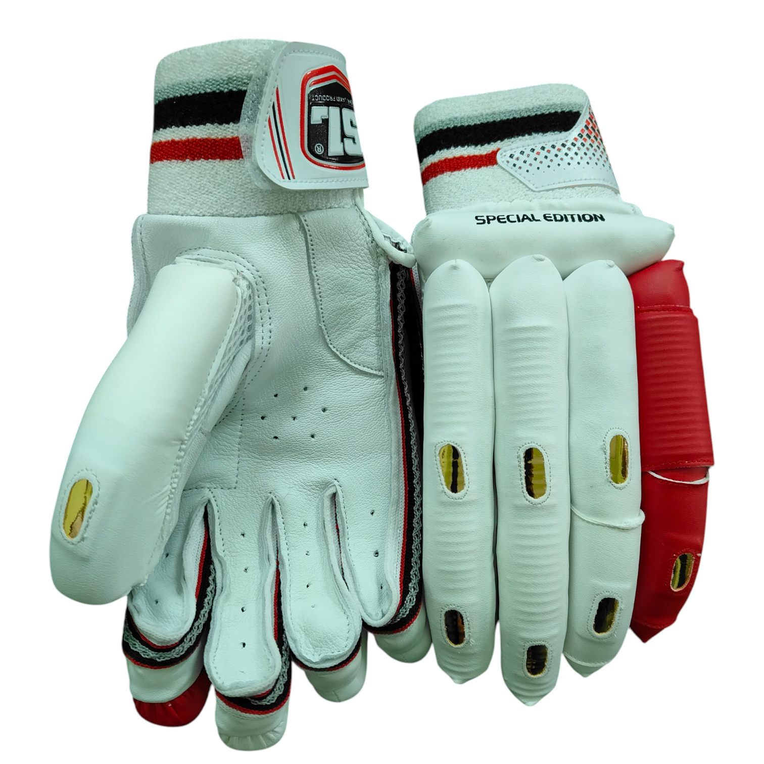 The SL Special Edition Cricket Batting Gloves are engineered for cricket players seeking lightweight performance without compromising on protection. Designed with an additional leather patch on hard-wearing areas, these gloves ensure long-lasting durability. The imported Taiwan Leather finger rolls, combined with lightweight HD foam, provide excellent cushioning and flexibility.